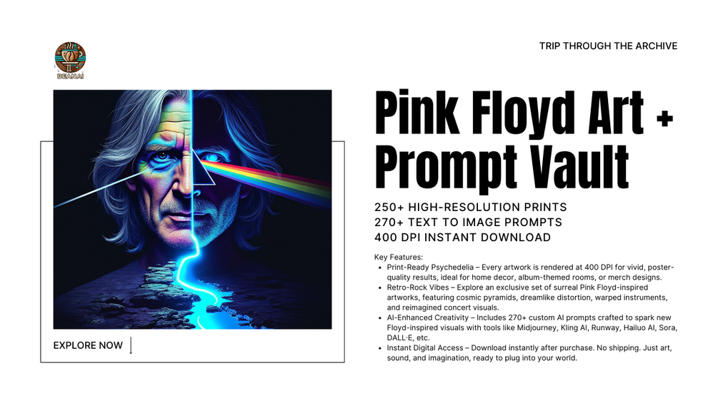 Pink Floyd AI Art Vault: 250+ Vintage Rock Prints + AI Prompts | 400 DPI Digital Download